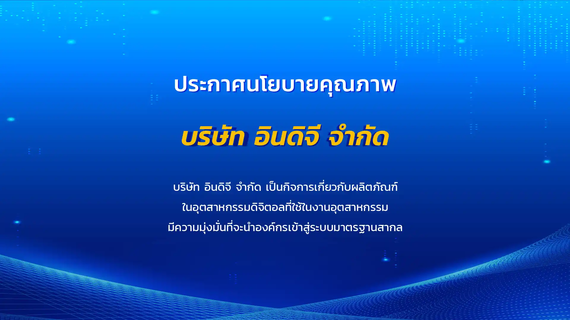 บริษัท อินดิจี จำกัด มีความมุ่งมั่นและตั้งใจในการให้บริการด้านผลิตภัณฑ์ในอุตสาหกรรมดิจิทัล เพื่อส่งมอบประสบการณ์ที่ดีที่สุดให้แก่ลูกค้า มุ่งเน้นการพัฒนาระบบคุณภาพในการทำงานของทุกหน่วยงานภายในบริษัทให้เป็นไปอย่างมีประสิทธิภาพสูงสุด พัฒนาความก้าวหน้าในการดำเนินธุรกิจ สามารถตอบสนองต่อความต้องการและความพึงพอใจของลูกค้าได้อย่างยั่งยืน เพื่อให้การดำเนินงานภายใต้ระบบบริหารเป็นไปตามมาตรฐานสากล